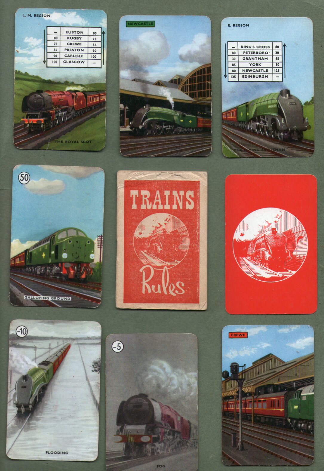 UK | Trains by Pepys 1962, endorsed by Ian Allan, a wonderful railway railroad deck of cards, nice artwork and colouring, depicting many famous locomotives, all cards + instructions book very good condition + outer box grubby with end flaps missing | £20.00 |