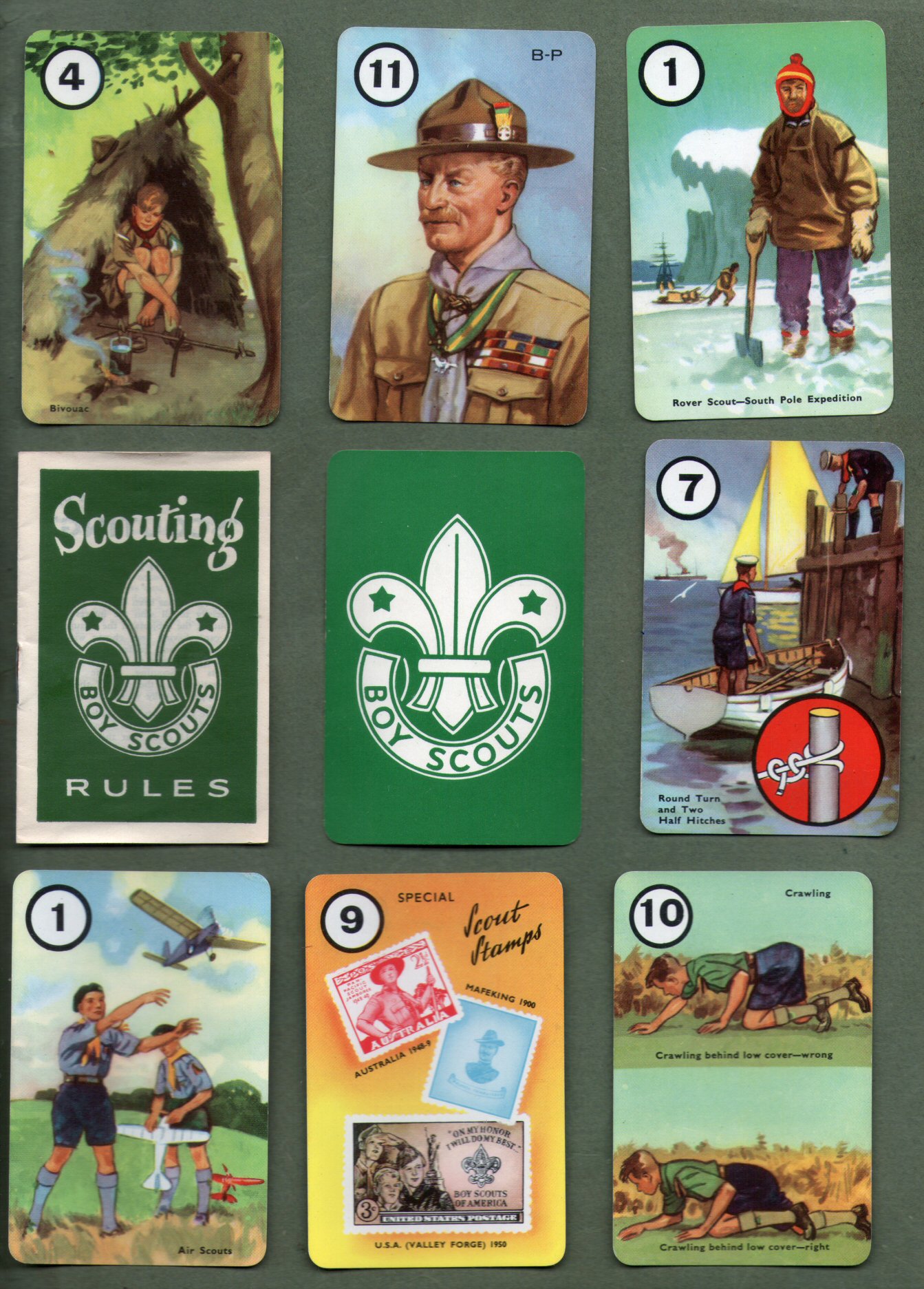 U.K. | Scouting by cards game Pepys. Wonderful colouring and art, all depicting boy scout activities, Baden Powell, etc. all cards + rules bklt MINT condition, but outer box has top flap repaired | £60.00 |