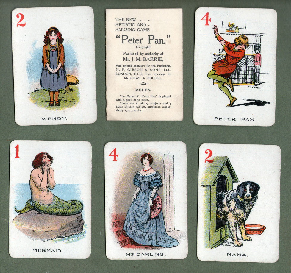 Peter Pan by Gibson circa 1910.card game . Art by Charles Buchel. 52 cards Mint in stiff box very good. "Wendy, Hook, Mermaid etc etc" | £35.00 |