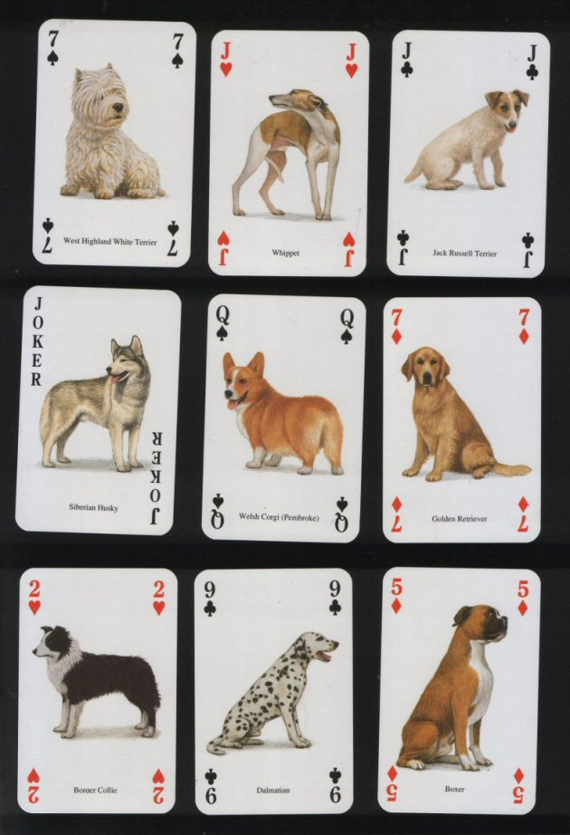 Non-standard playing cards. Dogs of the World, made for U.K. 52 different breeds, lovely colourful art, + special Joker + box, all Mint | SOLD | ||