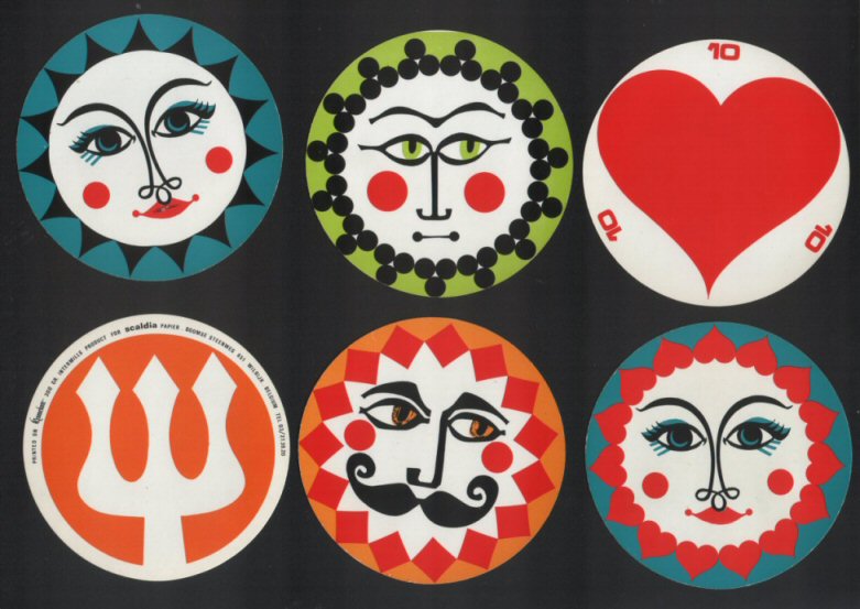 Non-standard playing cards. Scaldis circular card 1969 unusual ns designs nice colors art by Gerard Wibin. for paper company 52 + special card Mint+ box good condition . | Sold | ||