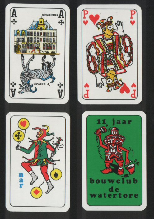 Non-standard playing cards courts. Bouwclub de Watertore, lovely cartoon type courts, produced specially for the club's 11 year anniversary 52 + special Joker + spare card + box M | P.O.R. | ||