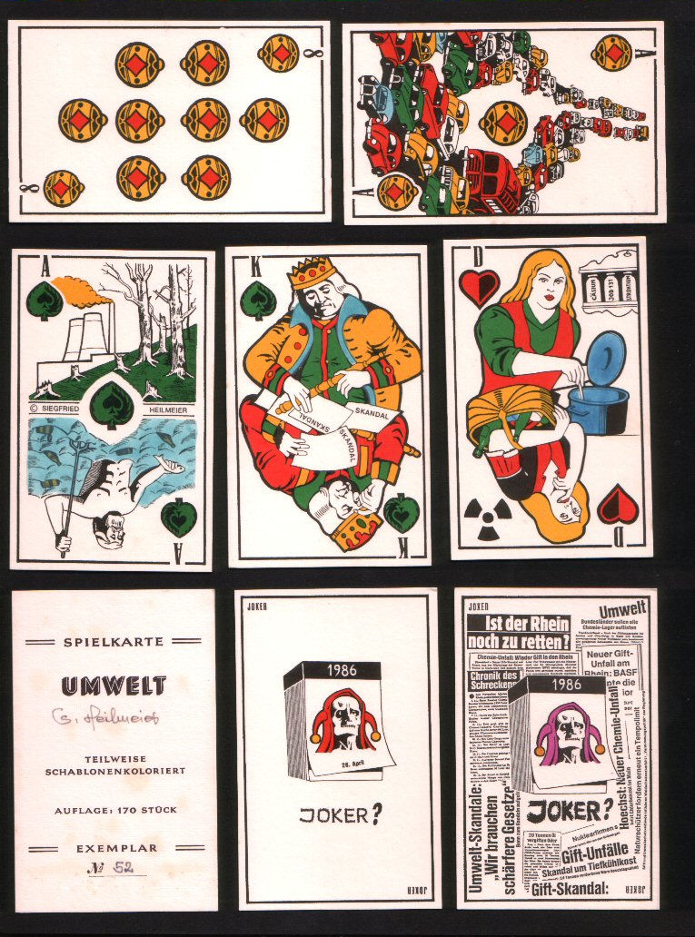 Non-standard playing cards. Umwelt. By artist Siegfried Heilmeier, hand-drawn, colored, number 52 of a limited edition of 170 cards refer to the process of world destruction re pollution etc. 1986. complete set of 32 cards + 2 special. Jokers + sc all MINT, + box n | N/A | |