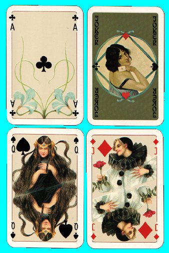 . Jugendstil Non-standard court playing cards 1979 copy of the 1902 deck, lovely art-nouveau cards, delightful colours, embellished aces 52 + 2 Special jokers M