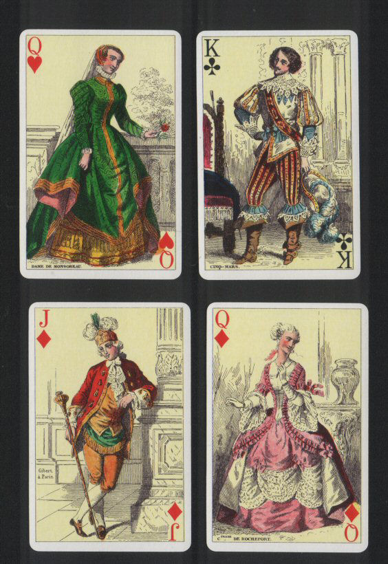 Non-standard playing cards courts. Trajes Franceses. Repro of 1850 playing cards deck by Gibert of Paris. Beautiful coloured courts in 16 - 17th century costumes. Lovely deck by Fournier. 52 + spare card mint gold-corners + lflt + box | P.O.R | |