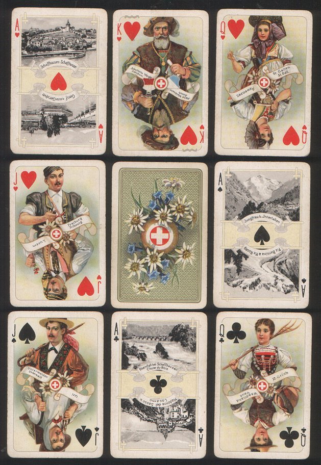 Non-standard courts PLAYING CARDS. La Suisse Historiques, by Muller 1925 , a beautiful art-deco style deck, lovely art & colouring, 52 + original box, good