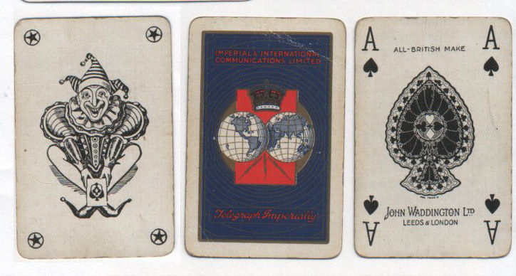 Advertising collectable playing cards . Imperial Int Communications Ltd. Scarce old English advertising deck in stiff shell-type box with compliments of the company. Backs show 2 world globes with the Royal crown above. Scarce ad deck but unfortunately very well used, outer box splitting at spine, fair-to-good 52 + joker + stiff box | £12.00 | |