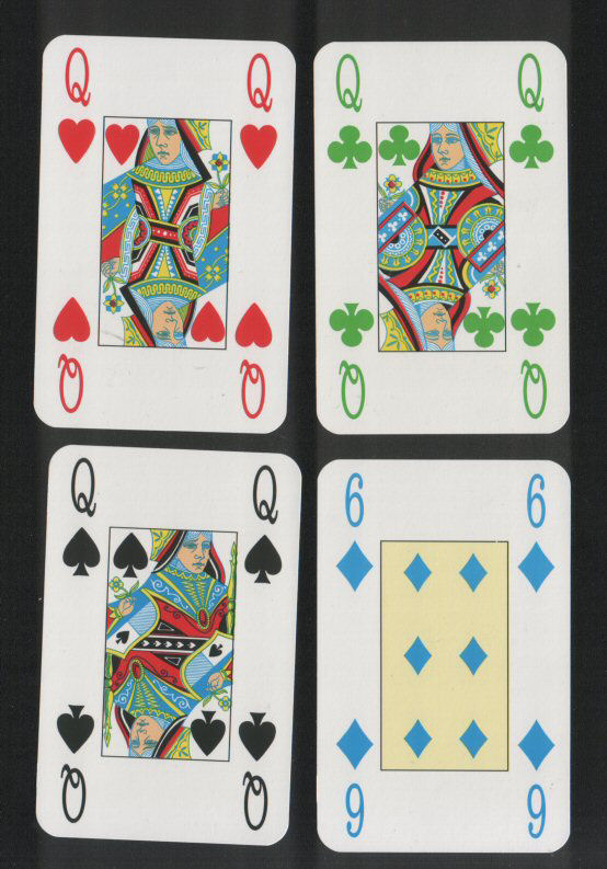 Non-standard playing cards. Colour-Suited, 4 different colour suits, diamonds are blue, clubs are green, large indices. 52 + Joker + box, all Mint | £ 8.00 | |