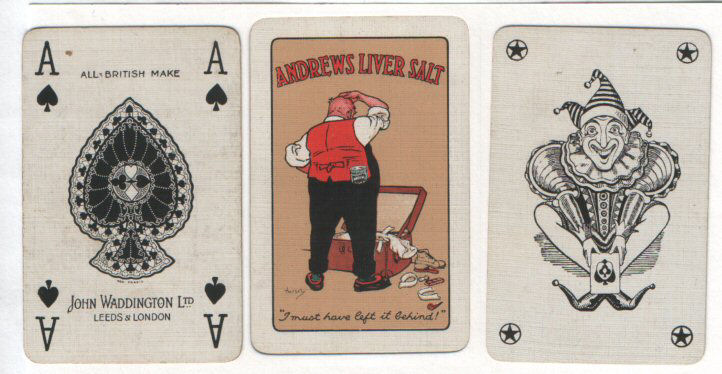 Advertising collectable playing cards . Andrew's Liver Salts. Lovely backs by artist Hassell shows old man packing suitcase & forgetting "Andrew's" in back pocket. 52 + spare card + joker all good + stiff shell-box fine | £16.00 | |
