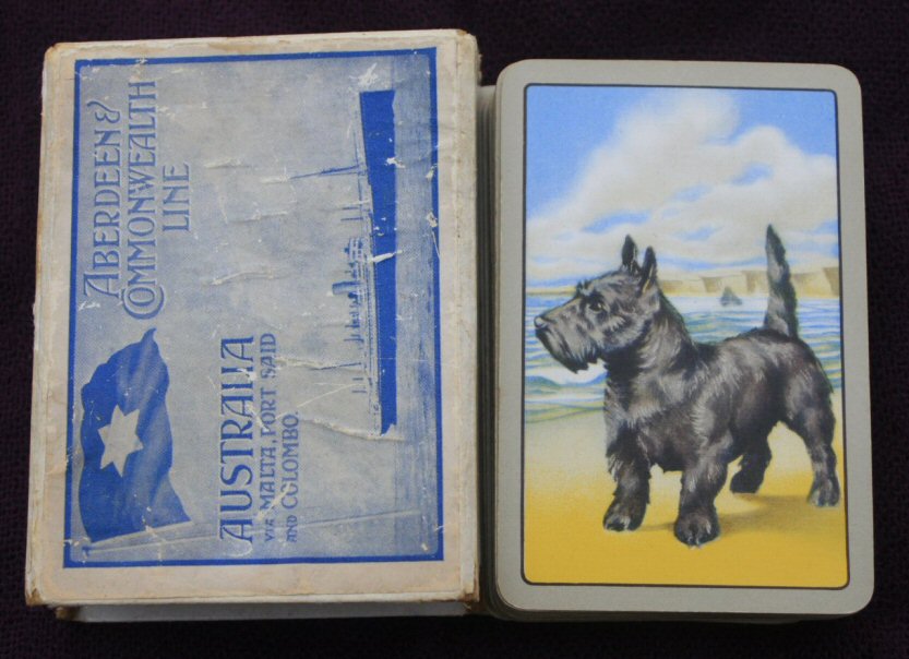 Advertising playing cards. Aberdeen and Commonwealth shipping Line. circa 1930's, Scottie terrier on reverse for company logo, box shows large ship at sea in blue colouring, and flag, 52 + joker all vg + stiff drawer-slide box good. Nice shipping item. | £24.00 | |