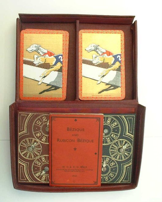 nn. "Greyhounds hurdling" as a Bezique set in special hinged box, complete in Mint condition, gold edges, + 64 page rules bklt + 2 bezique dial-markers all vg-nm | N/A | |