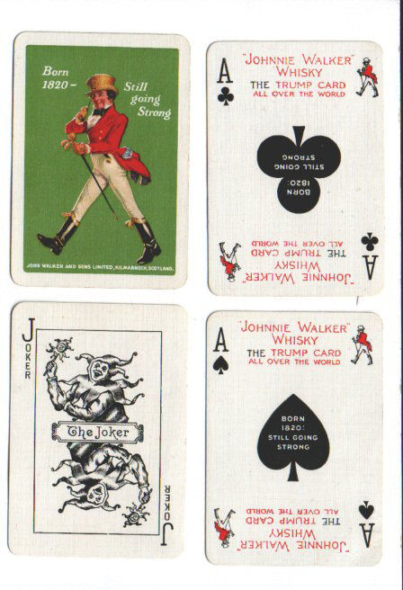 Advertising playing cards .ns aces. Johnnie Walker Whisky. Back shows gentleman walking on green background, aces have special ads and man walking through corners of cards, 52 + joker + stiff drawer box, all near-mint | £45.00 | |