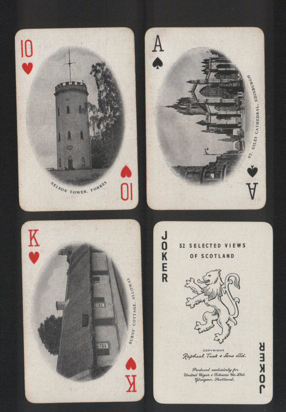 Non-standard playing cards . Selected views of Scotland by Raphael Tuck, printed in Great Britain, black & white oval framed images, circa 1940-50's. 52 diff + special joker + box, all good | SOLD | |