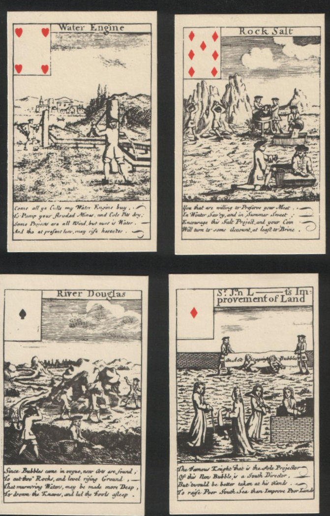 Non-standard playing cards . South Sea Bubble 1720. Faithful reproduction of the 1720 deck produced in 1988. Published by Whiting in 1988, 52 + 6 spare cards of information, all MINT + outer box good | £20.00 | |