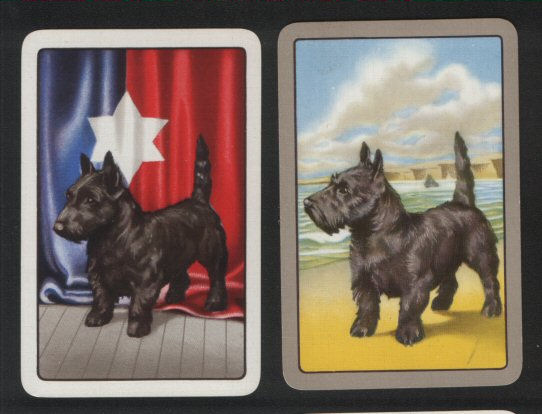 Advertising playing cards Double Deck. Aberdeen & Commonwealth Shipping Line, label inside lid shows sailings to Australia via Port Said Colombo and one of the larger ships. The backs of the cards shows Highland Terriers in different backdrops for each deck, This company used the dogs as their logo, being a Scottish company. " decks of 52 + 2 jokers + 2 Jokers each deck, all MINT plus special Double Deck box good | N/A | |