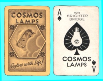Playing Cards - Cosmos lamps 1930-40's ? pretty ace with lamp, back yellow with pretty lady in hexagon. 52 vg + box g