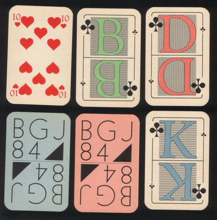 Non-standard courts playing cards. BGJ '84. Courts depicted as giant coloured letters, such as K for king, 2 different coloured backs for special game. 52 mint | £20.00