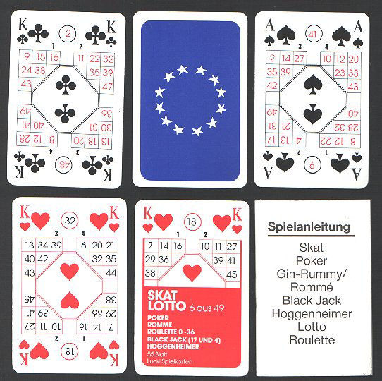 Non-standard playing cards. Skat Lotto, unusual deck with lottery numbered squares all over each playing card, purpose unknown. 52 + leaflet good. No box | N/A | |