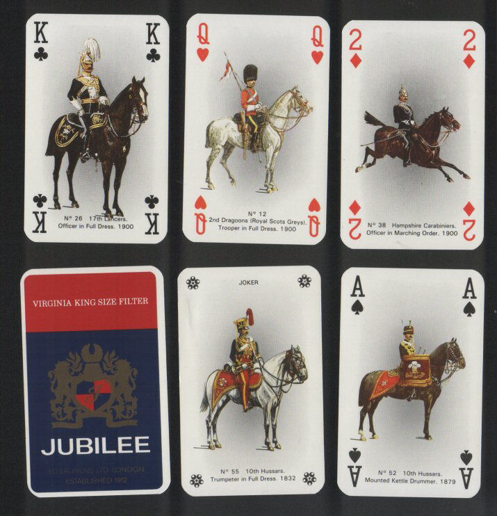 Non-standard playing cards. Jubilee cigarettes, mini patience size. All cards depict different cavalry soldiers on horseback, beautiful art. 52 + special Joker all mint | £25.00 | |