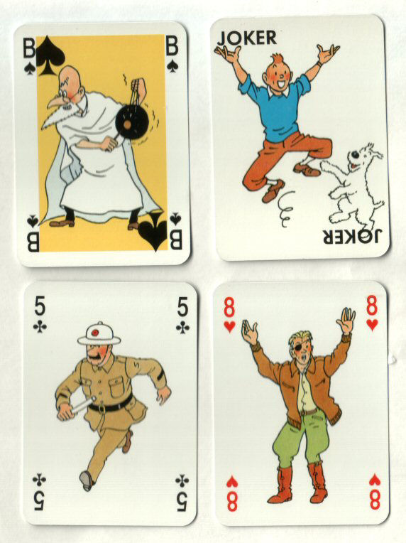 Non-standard playing cards. Tin-Tin. A delightful deck of cards with every card showing a character from the Tin-tin stories, delightful artwork by Herge, nice colours, 52 + special Joker + spare card, all MINT | Sold | |